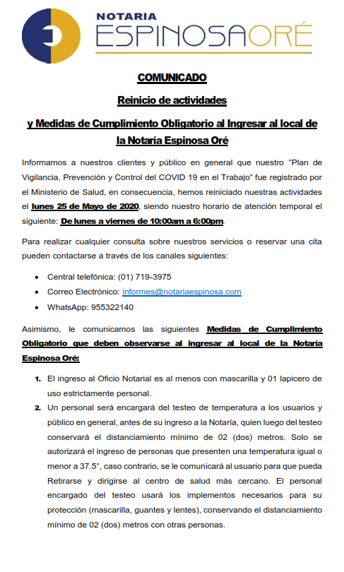 La NOTARÍA ESPINOSA ORÉ es una organización comprometida con la innovación y con el trabajo serio, ágil y responsable, el mismo que se desarrolla dentro de los más altos estándares de rigurosidad y ética.